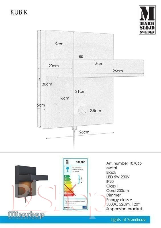 Количество ламп: 1. Тип цоколя: LED. Высота (см): 31. Ширина (см): 26. Глубина (см): 20. Мощность лампы (Вт): 5.