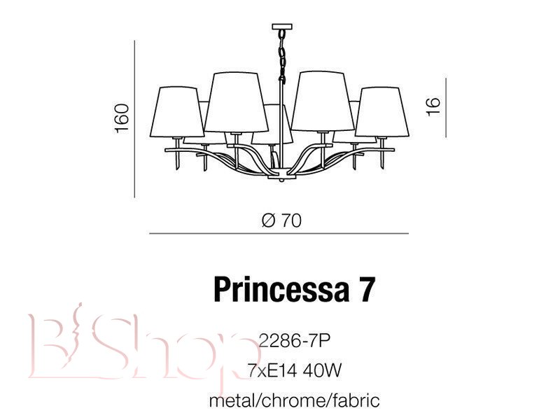 Количество ламп: 7. Тип цоколя: E14. Высота (см): 160. Мощность лампы (Вт): 40. Диаметр (см): 70.