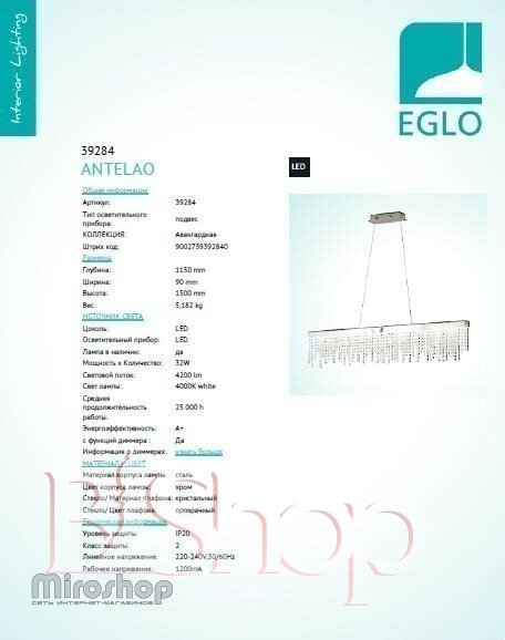 Количество ламп: 1. Тип цоколя: LED. Высота (см): 150. Ширина (см): 9. Мощность лампы (Вт): 32. Длина (см): 115.