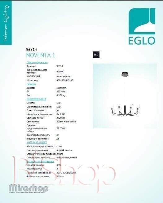 Количество ламп: 8. Тип цоколя: LED. Высота (см): 150. Мощность лампы (Вт): 3.3. Диаметр (см): 82.5.