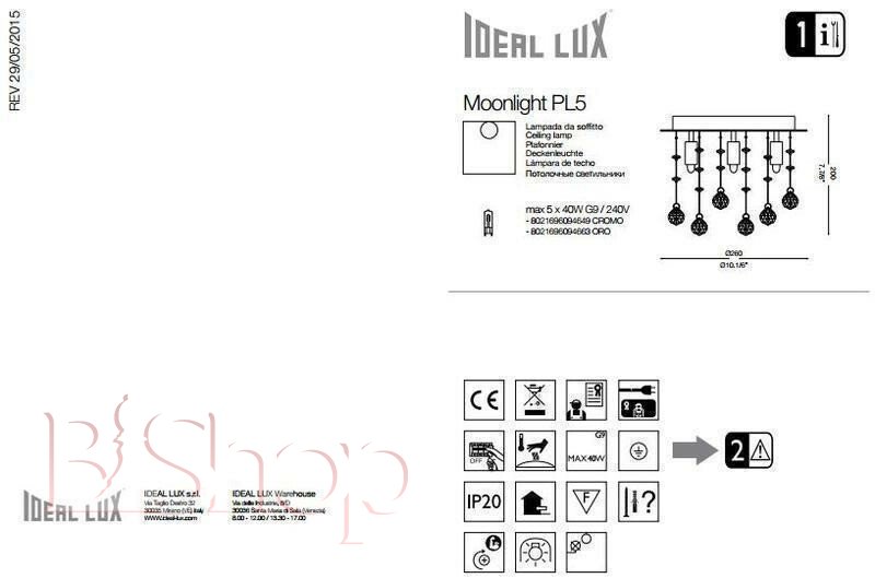 Количество ламп: 5. Тип цоколя: G9. Высота (см): 20. Мощность лампы (Вт): 40. Диаметр (см): 26.