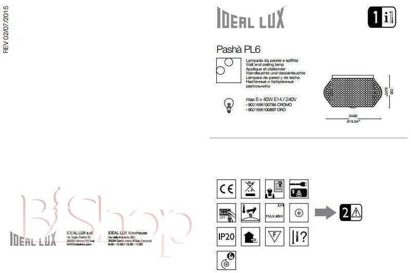 Количество ламп: 6. Тип цоколя: E14. Высота (см): 22. Мощность лампы (Вт): 40. Диаметр (см): 40.