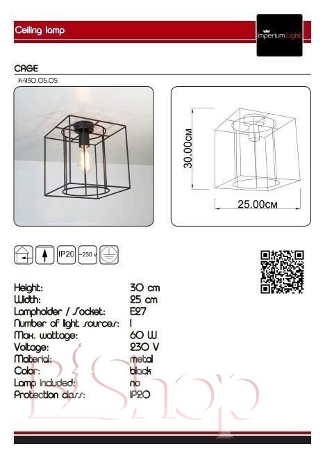 Количество ламп: 1. Тип цоколя: E27. Высота (см): 25. Мощность лампы (Вт): 60. Длина (см): 30.