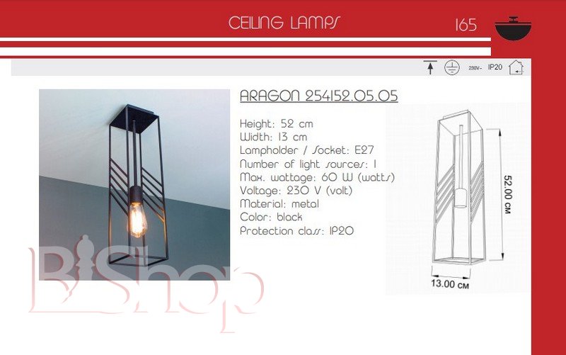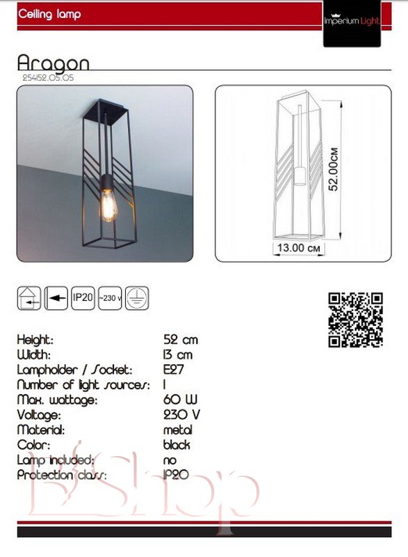 Количество ламп: 1. Тип цоколя: E27. Высота (см): 52. Ширина (см): 13. Мощность лампы (Вт): 60.