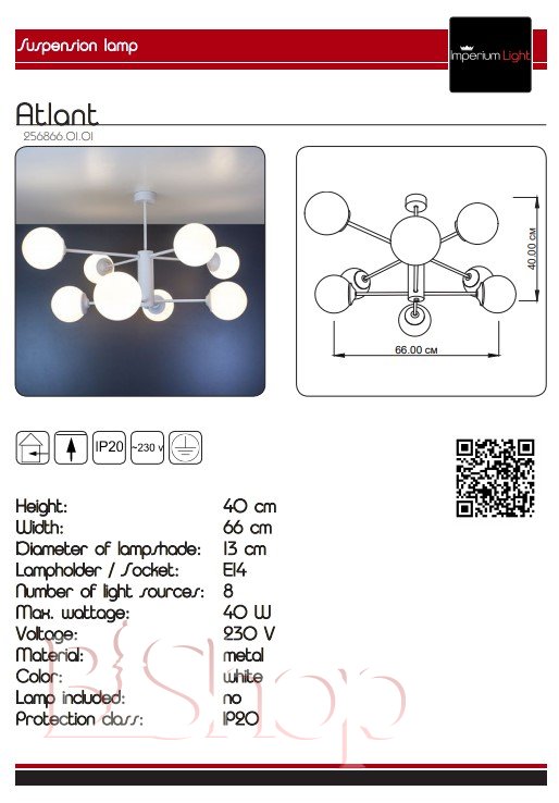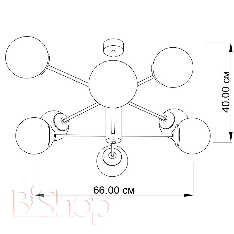 Количество ламп: 8. Тип цоколя: E14. Высота (см): 40. Ширина (см): 66. Мощность лампы (Вт): 40.