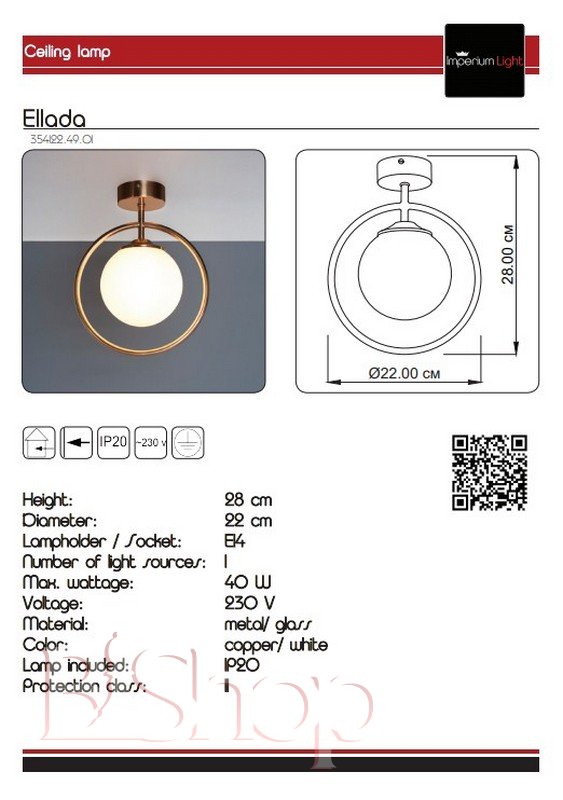 Количество ламп: 1. Тип цоколя: E14. Высота (см): 28. Ширина (см): 22. Мощность лампы (Вт): 40.