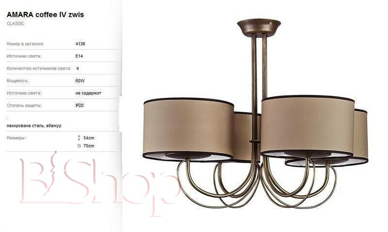 Количество ламп: 4. Тип цоколя: E14. Высота (см): 54. Мощность лампы (Вт): 60. Диаметр (см): 70.