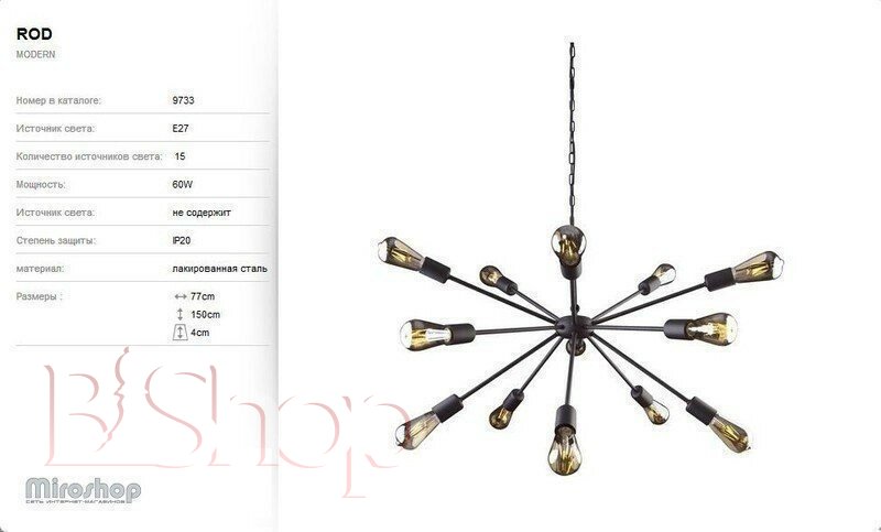 Количество ламп: 15. Тип цоколя: E27. Высота (см): 150. Мощность лампы (Вт): 60. Диаметр (см): 77.