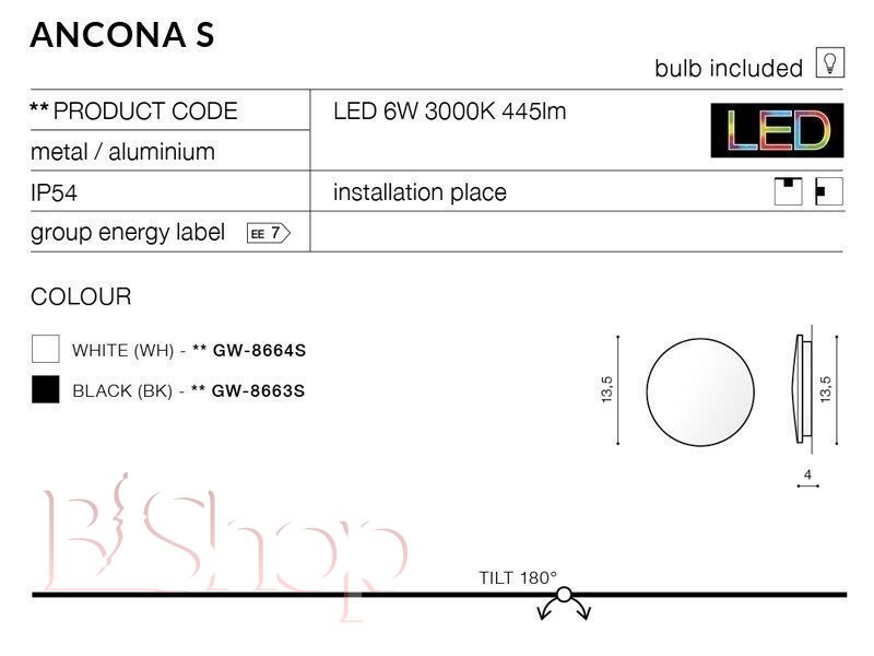 Количество ламп: 1. Тип цоколя: LED. Высота (см): 13.5. Глубина (см): 4. Мощность лампы (Вт): 6.