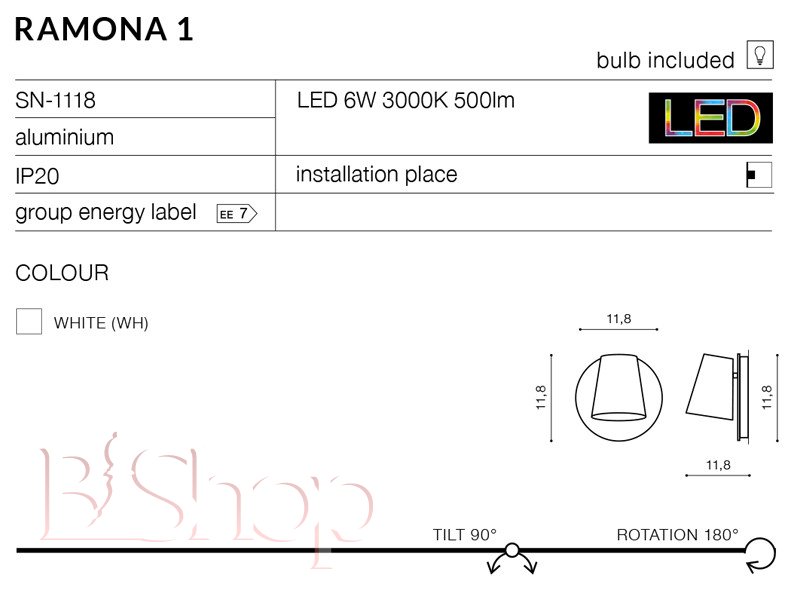 Количество ламп: 1. Тип цоколя: LED. Высота (см): 12. Ширина (см): 12. Глубина (см): 12. Мощность лампы (Вт): 6.