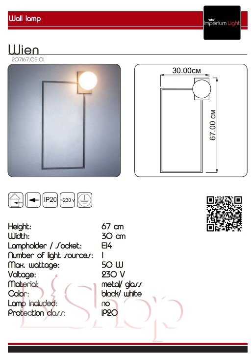Количество ламп: 1. Тип цоколя: E14. Высота (см): 67. Ширина (см): 30. Мощность лампы (Вт): 50.