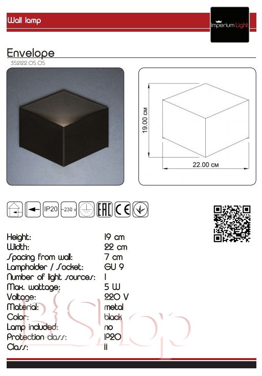 Количество ламп: 1. Тип цоколя: G9. Высота (см): 19. Ширина (см): 22. Глубина (см): 7. Мощность лампы (Вт): 5.