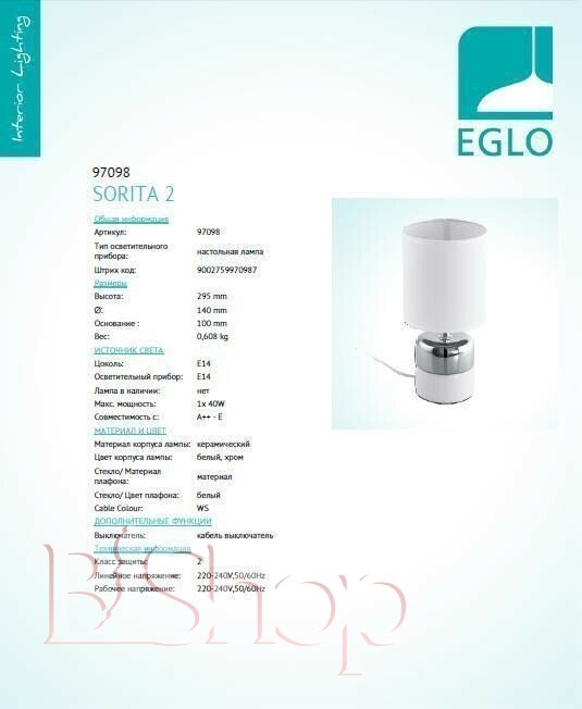 Количество ламп: 1. Тип цоколя: E14. Высота (см): 29.5. Мощность лампы (Вт): 40. Диаметр (см): 14.