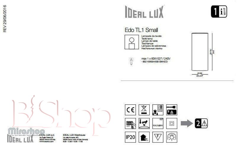 Количество ламп: 1. Тип цоколя: E27. Высота (см): 23. Мощность лампы (Вт): 60. Диаметр (см): 10.
