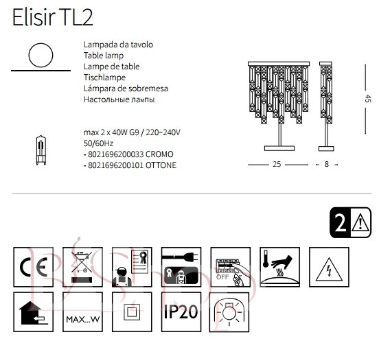 Количество ламп: 2. Тип цоколя: G9. Высота (см): 45. Ширина (см): 25. Мощность лампы (Вт): 40.