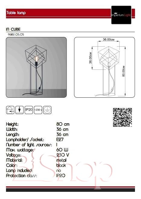 Количество ламп: 1. Тип цоколя: E27. Высота (см): 80. Ширина (см): 36. Мощность лампы (Вт): 60. Длина (см): 36.