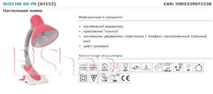Настольная лампа Kanlux SUZI HR-60-PK (7153) (84459)