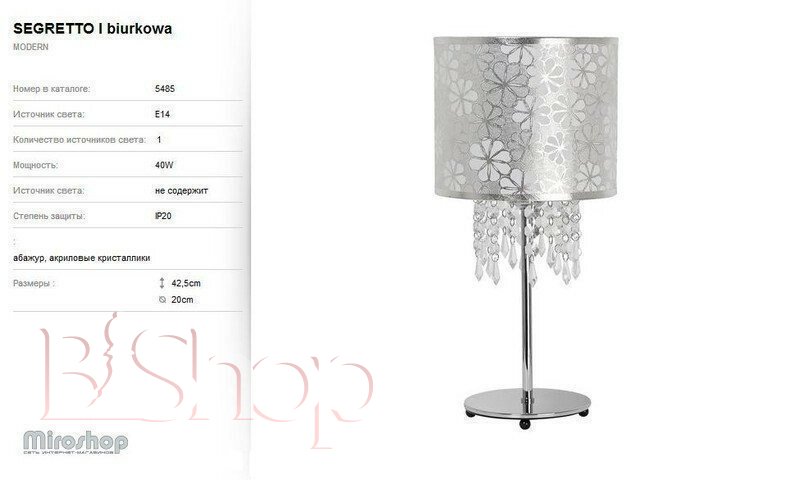 Количество ламп: 1. Тип цоколя: E14. Высота (см): 42.5. Мощность лампы (Вт): 40. Диаметр (см): 20.