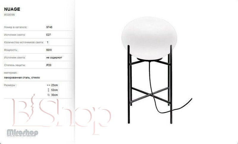 Количество ламп: 1. Тип цоколя: E27. Высота (см): 52. Мощность лампы (Вт): 60. Диаметр (см): 30.