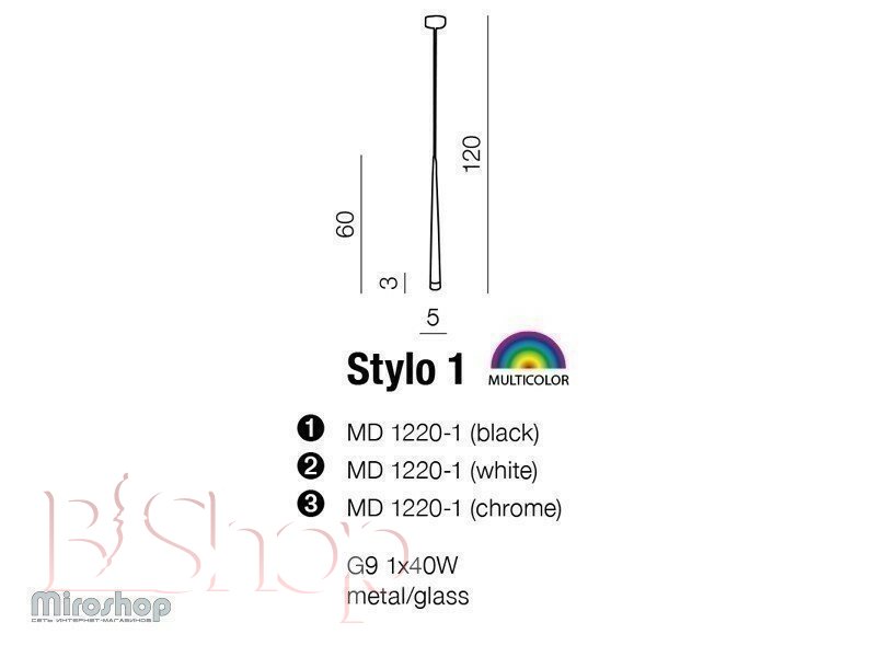 Количество ламп: 1. Тип цоколя: G9. Высота (см): 120. Мощность лампы (Вт): 40. Диаметр (см): 5.