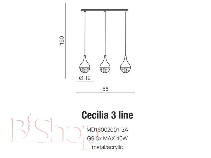 Количество ламп: 3. Тип цоколя: G9. Высота (см): 150. Мощность лампы (Вт): 40. Диаметр (см): 55.
