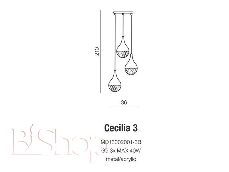 Количество ламп: 3. Тип цоколя: G9. Высота (см): 210. Мощность лампы (Вт): 40. Диаметр (см): 36.