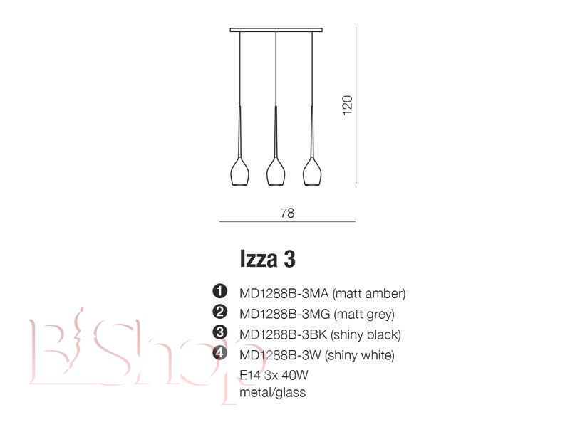 Количество ламп: 3. Тип цоколя: E14. Высота (см): 120. Ширина (см): 13. Мощность лампы (Вт): 40. Длина (см): 78.