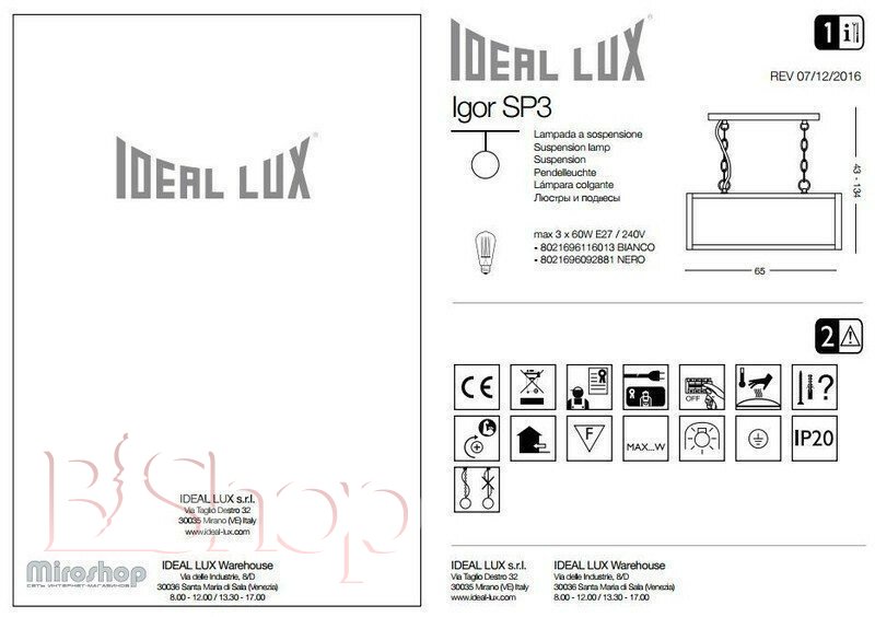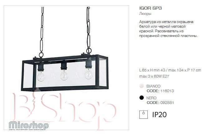 Подвесной светильник Ideal Lux IGOR SP3 NERO (092881)