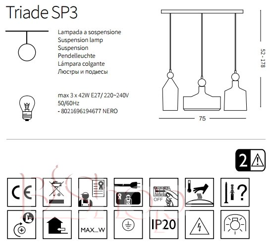 Количество ламп: 3. Тип цоколя: E27. Высота (см): 178. Ширина (см): 25. Мощность лампы (Вт): 42. Длина (см): 75.