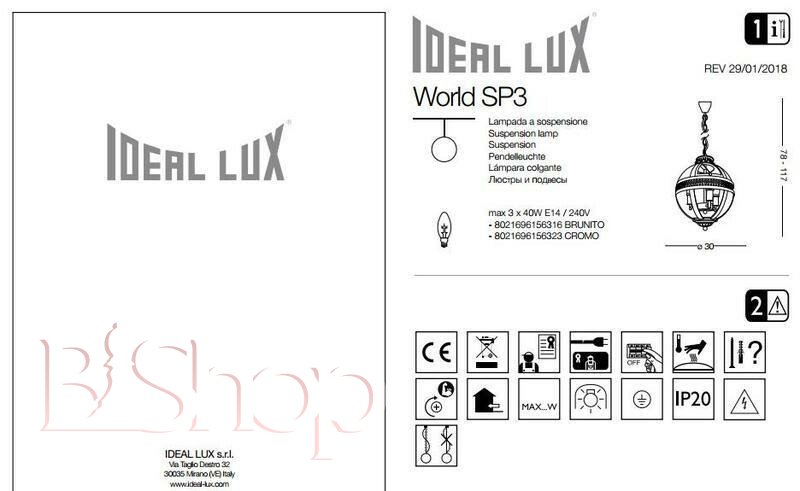 Подвесной светильник Ideal Lux WORLD SP3 BRUNITO (156316) (13431)