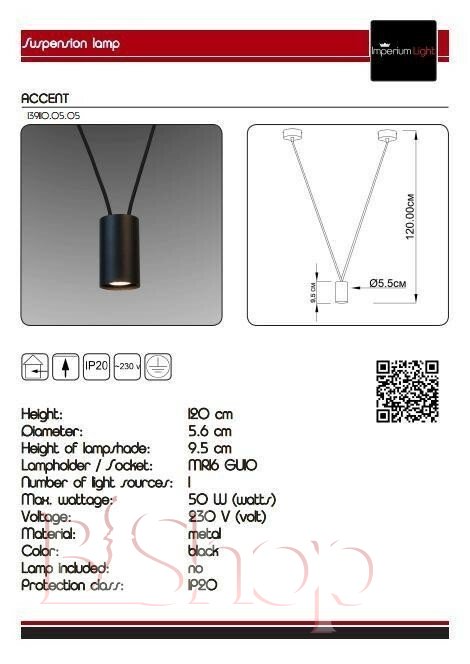 Количество ламп: 1. Тип цоколя: GU10. Высота (см): 120. Мощность лампы (Вт): 50. Диаметр (см): 5.6.