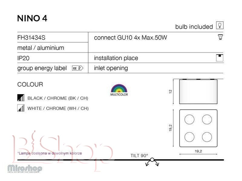 Количество ламп: 4. Тип цоколя: GU10. Высота (см): 12. Ширина (см): 19.2. Мощность лампы (Вт): 50. Длина (см): 19.2.