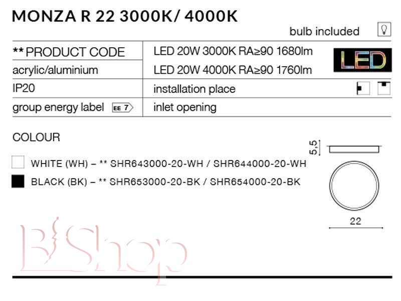 Количество ламп: 1. Тип цоколя: LED. Высота (см): 5.5. Мощность лампы (Вт): 20. Диаметр (см): 22.