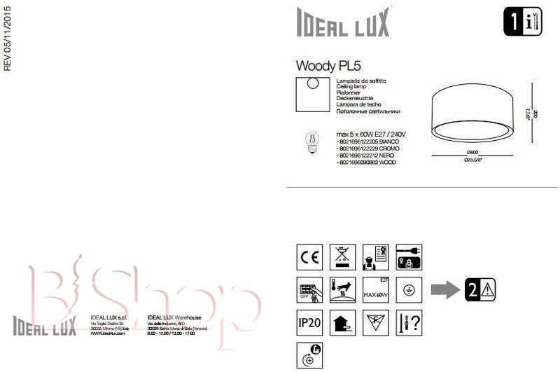 Потолочный светильник Ideal Lux WOODY PL5 BIANCO (122205) (88087)