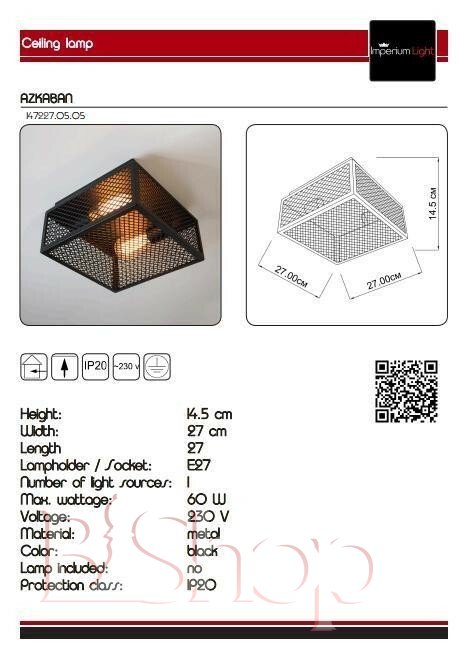 Количество ламп: 1. Тип цоколя: E27. Высота (см): 14.5. Ширина (см): 27. Мощность лампы (Вт): 60. Длина (см): 27.