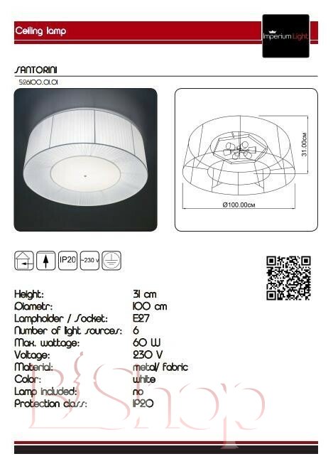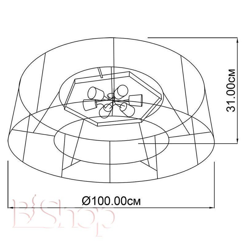 Количество ламп: 6. Тип цоколя: E27. Высота (см): 31. Мощность лампы (Вт): 60. Диаметр (см): 100.