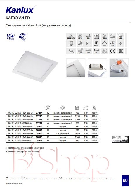 Количество ламп: 1. Тип цоколя: LED. Ширина (см): 17. Мощность лампы (Вт): 12. Длина (см): 17. Размер врезного отверстия (см): 15.8х15.8.