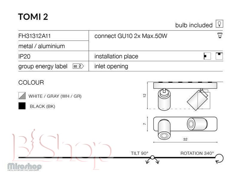 Количество ламп: 2. Тип цоколя: GU10. Высота (см): 12. Ширина (см): 7. Мощность лампы (Вт): 50. Длина (см): 31.