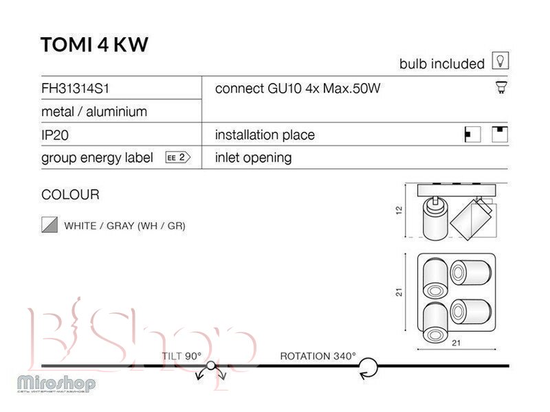 Количество ламп: 4. Тип цоколя: GU10. Высота (см): 12. Ширина (см): 21. Мощность лампы (Вт): 50. Длина (см): 21.