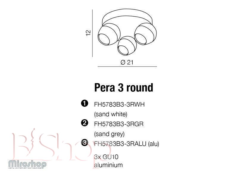 Количество ламп: 3. Тип цоколя: GU10. Высота (см): 12. Диаметр (см): 21.