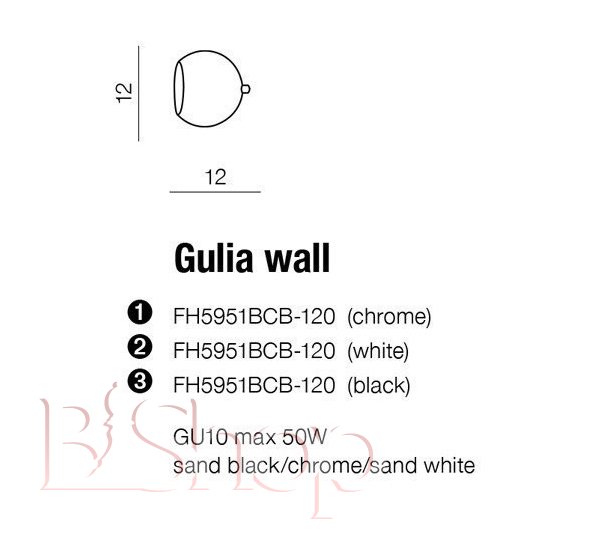 Количество ламп: 1. Тип цоколя: GU10. Высота (см): 12. Ширина (см): 12. Мощность лампы (Вт): 50.