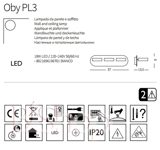 Количество ламп: 3. Тип цоколя: LED. Высота (см): 8. Ширина (см): 37. Глубина (см): 13.5. Мощность лампы (Вт): 6.