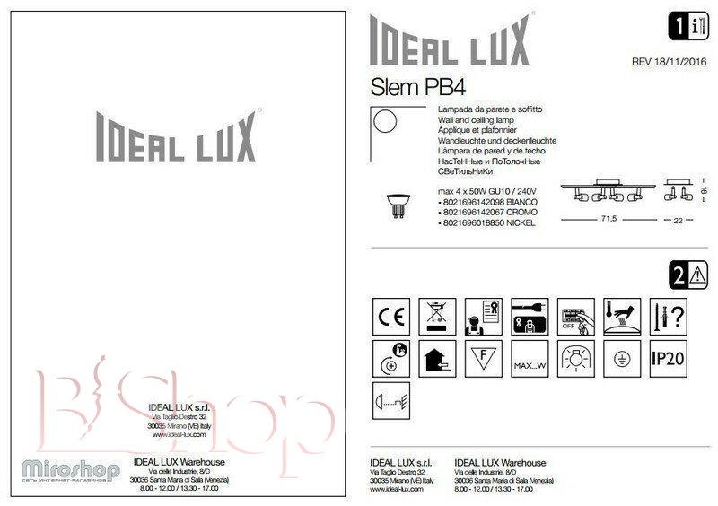 Количество ламп: 4. Тип цоколя: GU10. Высота (см): 22. Ширина (см): 16. Мощность лампы (Вт): 50. Длина (см): 71.5.