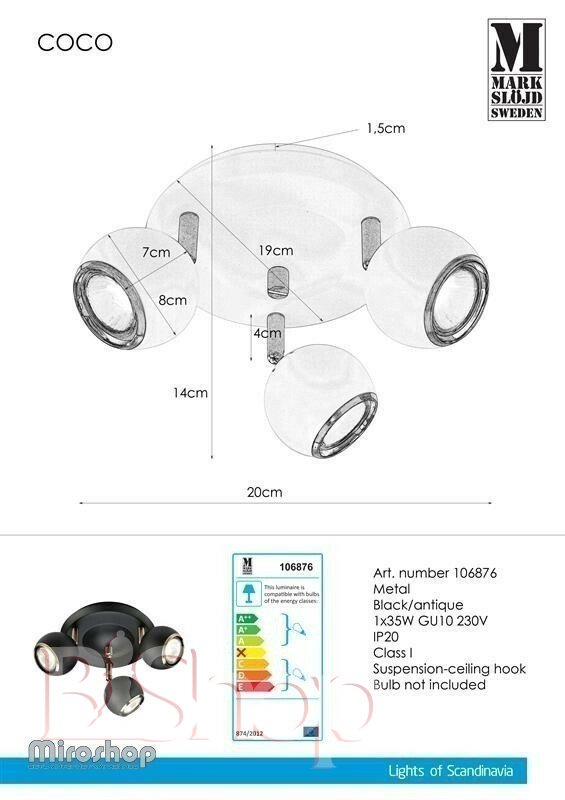 Количество ламп: 3. Тип цоколя: GU10. Высота (см): 14. Мощность лампы (Вт): 35. Диаметр (см): 29.