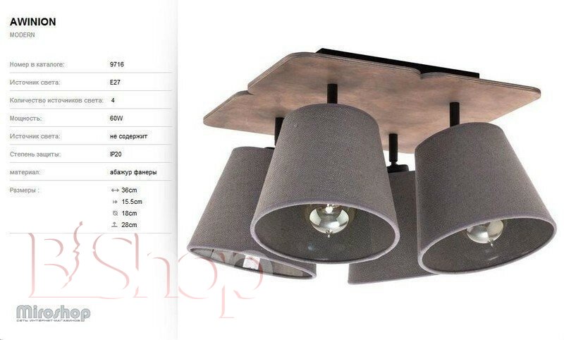 Количество ламп: 4. Тип цоколя: E27. Высота (см): 28. Ширина (см): 36. Мощность лампы (Вт): 60. Длина (см): 36.