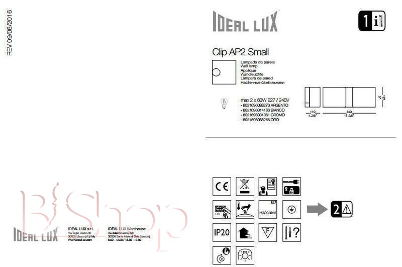 Светильник настенный Ideal Lux CLIP AP2 SMALL ARGENTO (088273) (67446)