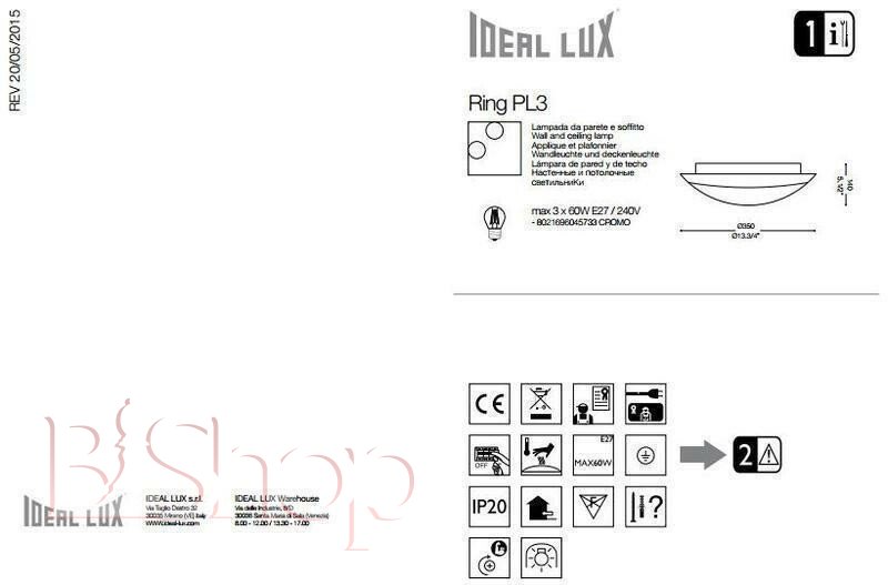 Количество ламп: 3. Тип цоколя: E27. Высота (см): 14. Мощность лампы (Вт): 60. Диаметр (см): 35.