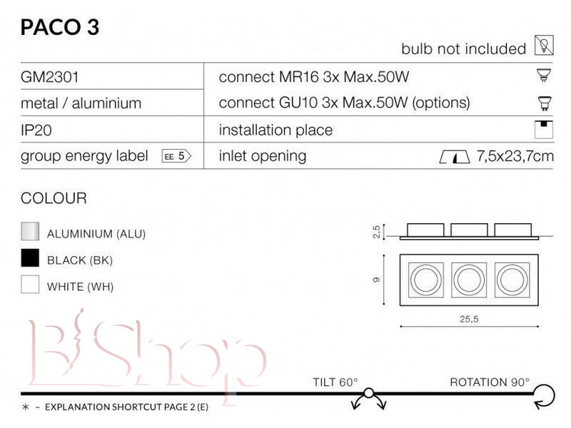Количество ламп: 3. Тип цоколя: GU10. Высота (см): 2.5. Ширина (см): 9. Мощность лампы (Вт): 50. Длина (см): 25.5.