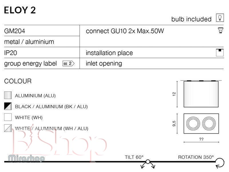 Количество ламп: 2. Тип цоколя: GU10. Высота (см): 12. Ширина (см): 9.5. Мощность лампы (Вт): 50. Длина (см): 19.5.