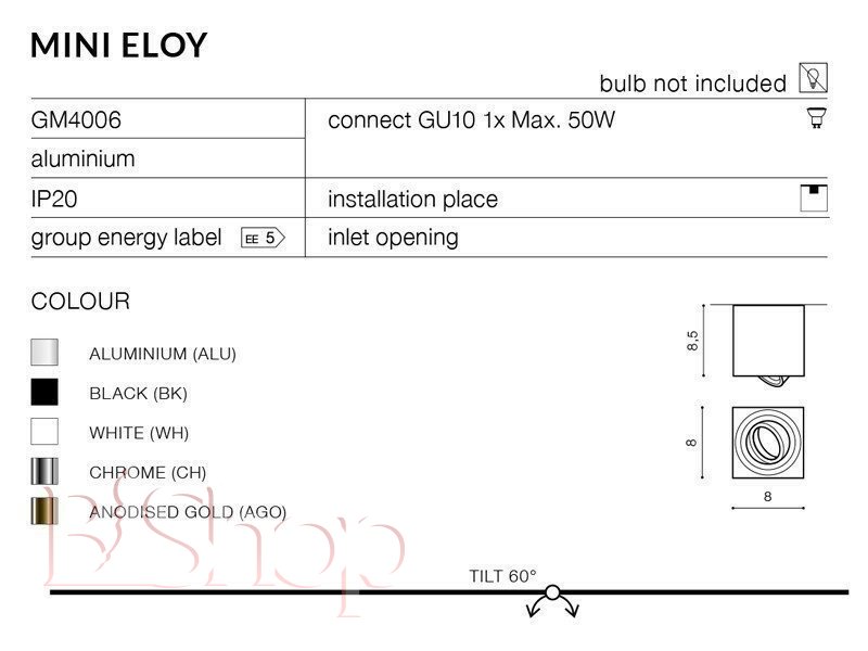 Количество ламп: 1. Тип цоколя: GU10. Высота (см): 8.5. Ширина (см): 8. Мощность лампы (Вт): 50. Длина (см): 8.